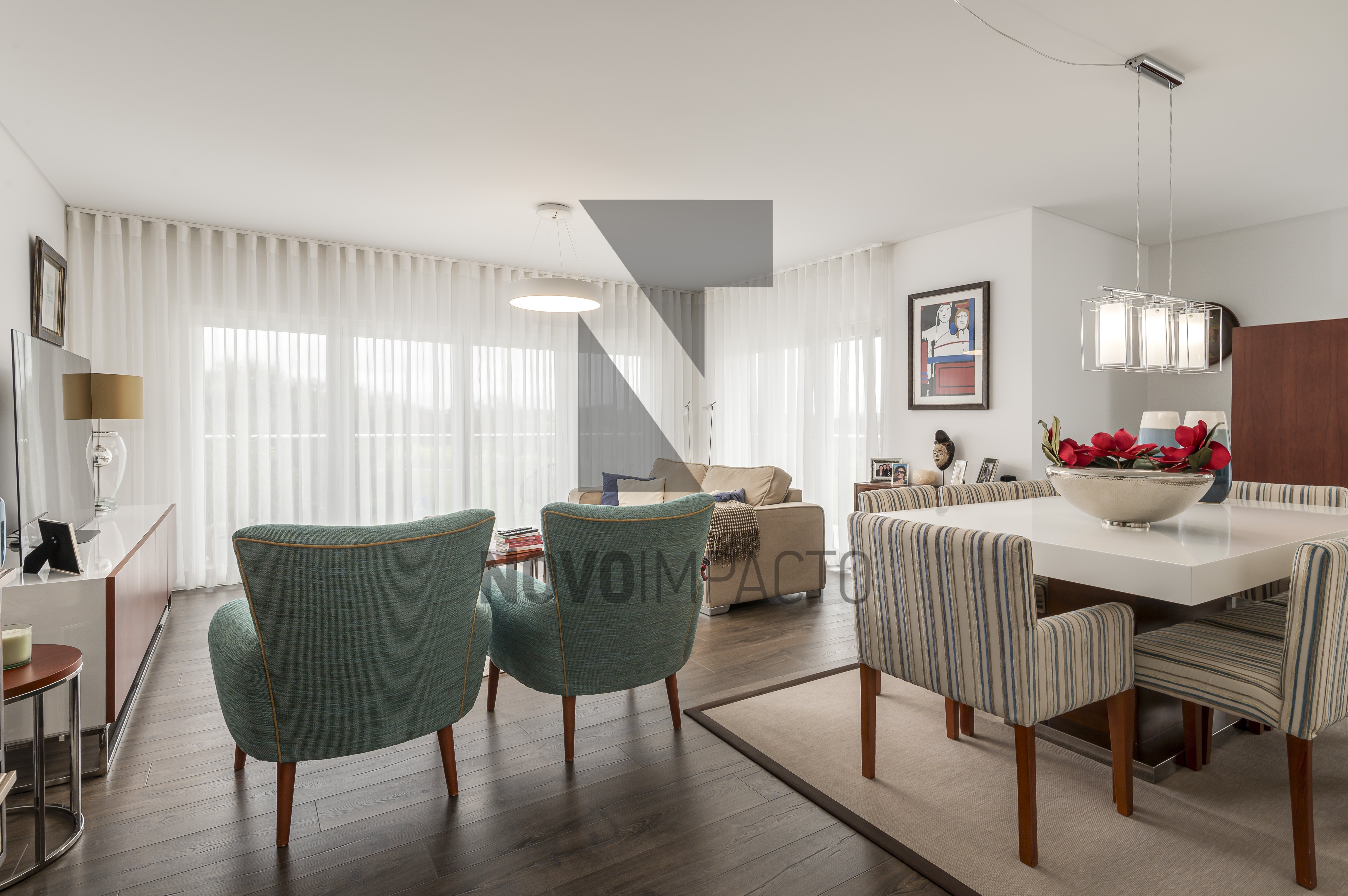 A sala ampla, voltada a nascente, beneficia de vista desafogada e abundante luz natural.